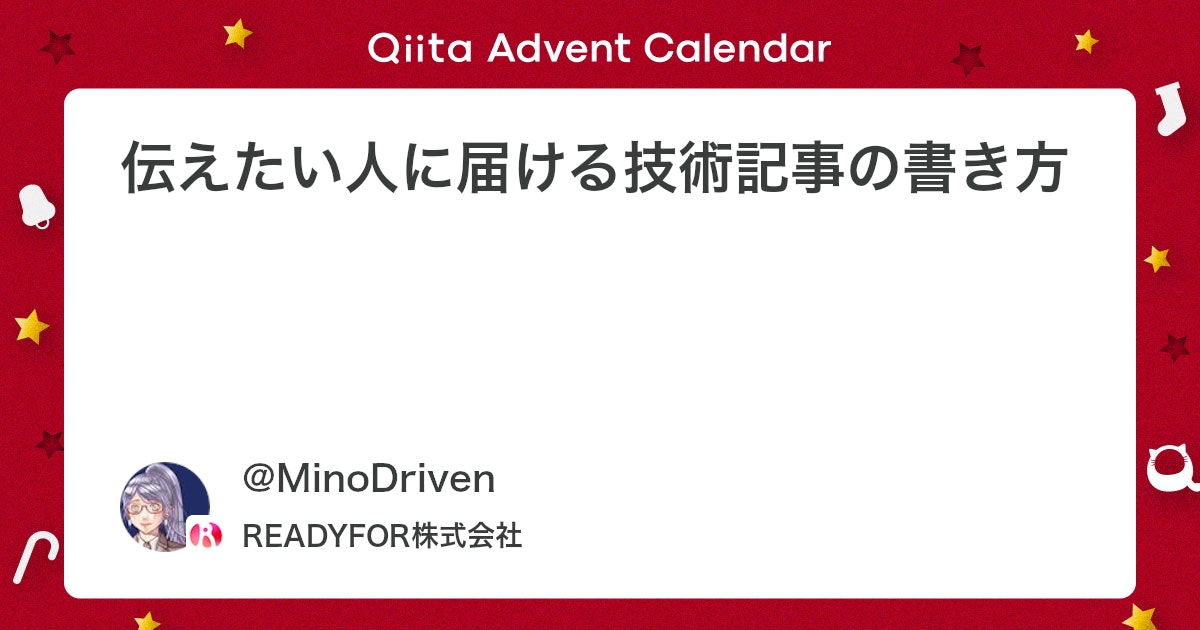 こんにちは、リファクタリングが大好きなミノ駆動です。 この記事は READYFORアドベントカレンダー2021 、初日の記事です。 なにこれ? 苦労して執筆した技術記事は、伝えたい人にしっかり伝えたいですよね。 また、最後まで読んでもらいたいですよね。 一方で、構成などに...
